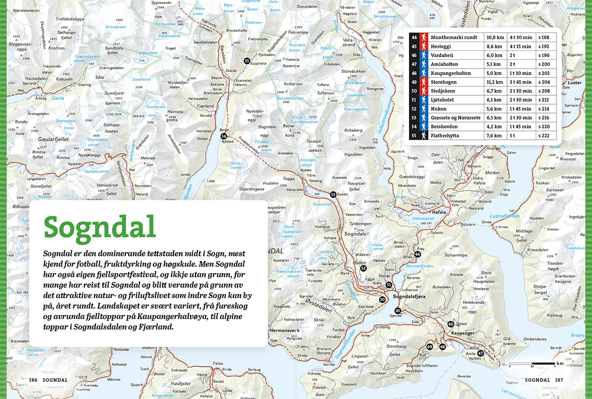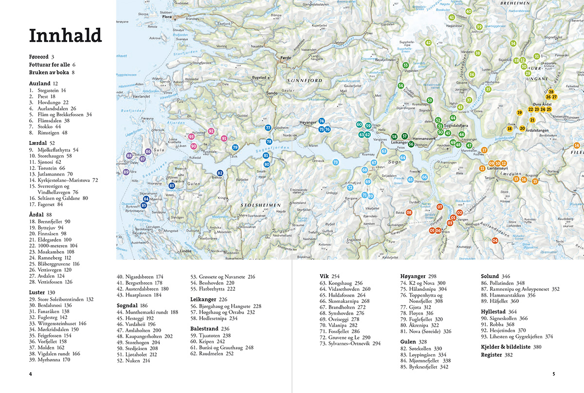 Aurland, Lærdal, Årdal, Luster, Sogndal, Leikanger, Balestrand, Vik, Høyanger, Gulen, Solund og Hyllestad. Boka gir deg alt du treng for å planleggje turane, med gode skildringar og detaljerte kart til kvar tur.