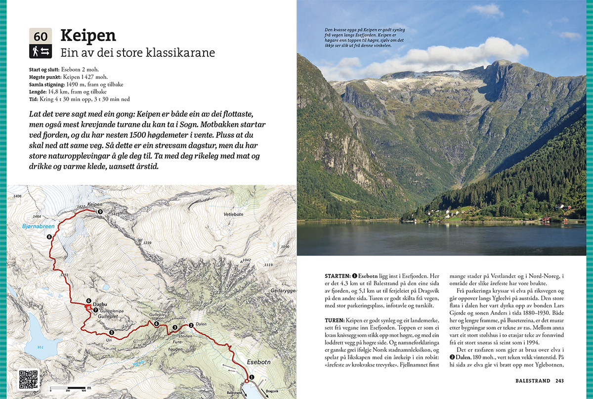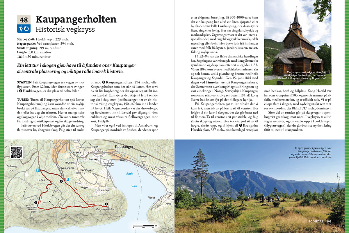 Kvart kart i denne boka er utstyrt med ein QR-kode. Skann koden med mobilkameraet, så kan du enkelt følgje turforslaget på telefonen.
