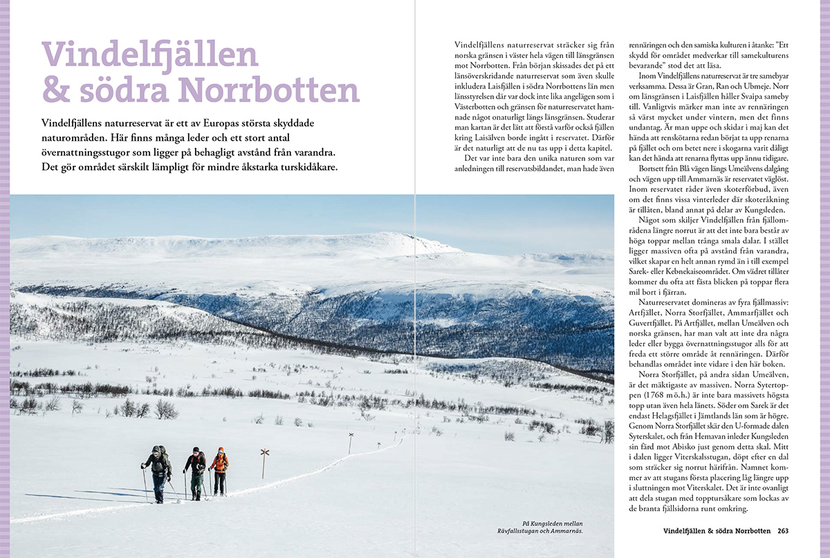 Boken består av två delar: först en omfattande handledning med all kunskap du behöver för att planera och genomföra en vintertur mellan fjällstugor, därefter en guide till våra finaste fjällområden med femton färdiga turförslag som passar både nybörjare och erfarna skidåkare.
