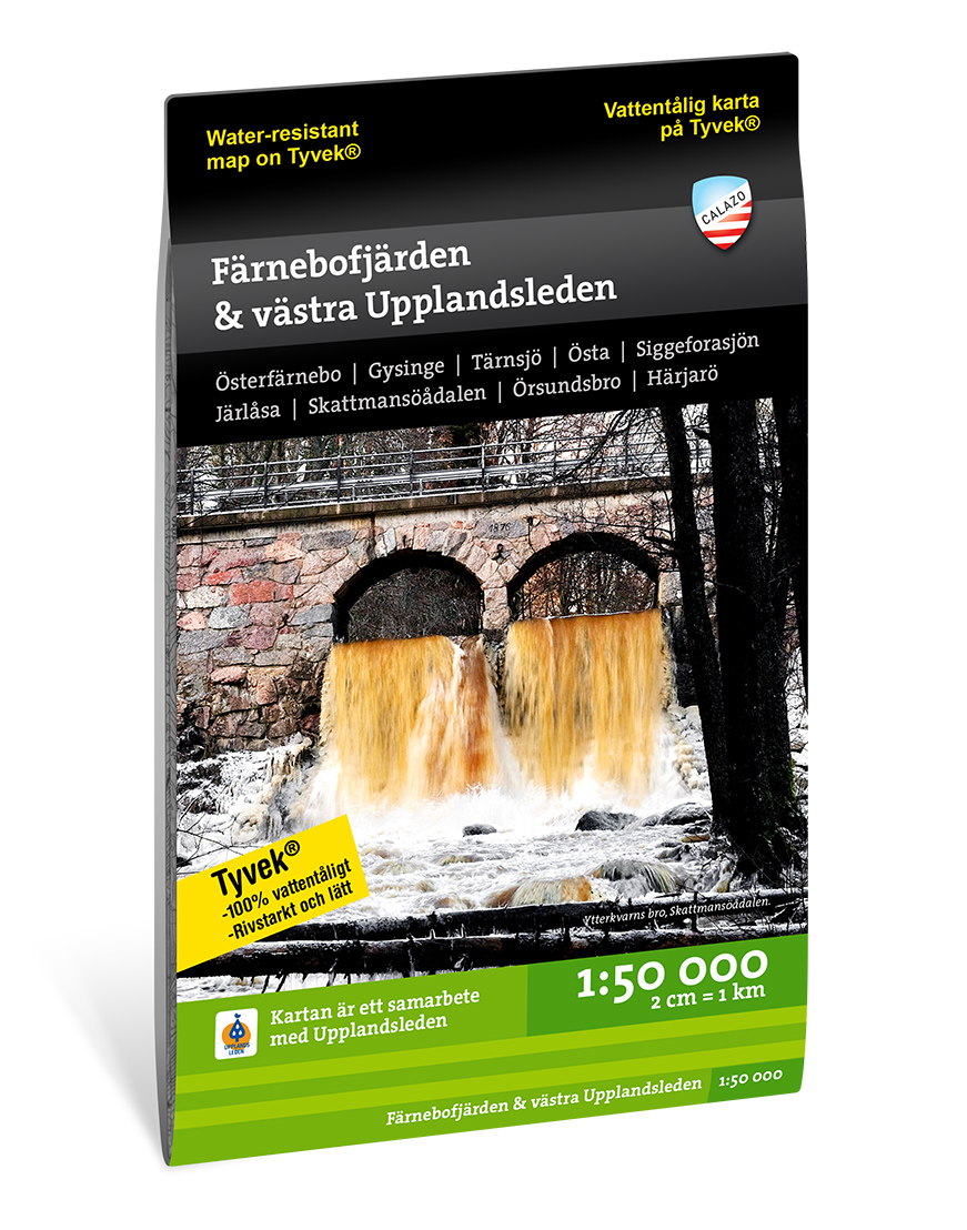 Den här är en vattentålig terrängkarta som vi har tagit fram i samarbete med Upplandsstiftelsen. Den täcker den västra delen av Upplandsleden från Siggeforasjön ner till Härjarö och den fristående delen leden vid Färnebofjärden. Kartan i skalan 1:50 000 och är som alla våra andra tillverkad i syntetmaterialet Tyvek.