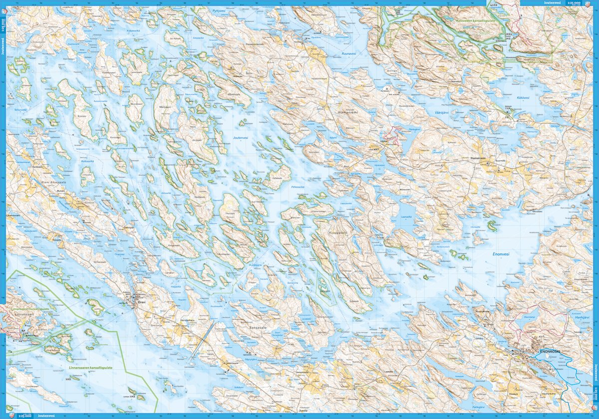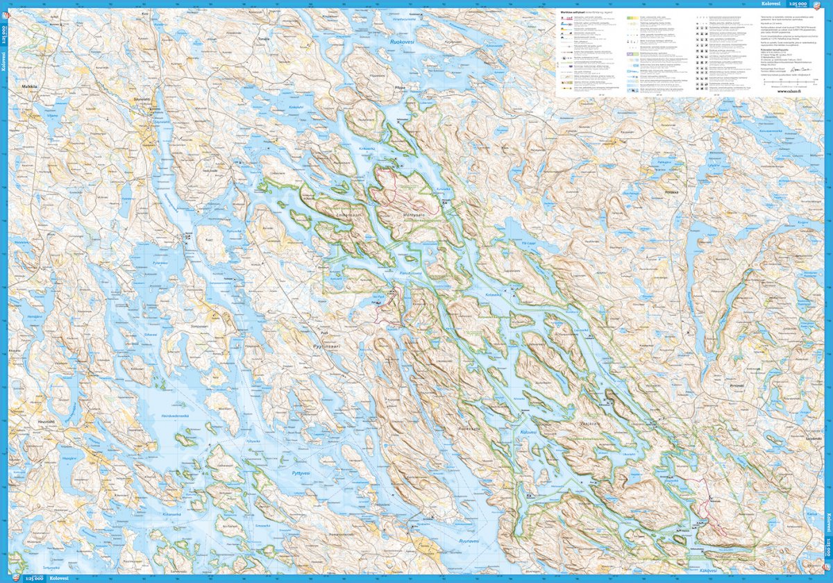 Karttamme painetaan vedenkestävällä ja repeämättömälle Tyvek-materiaalille. Laserkeilausaineiston ansiosta siinä on 2,5 metrin korkeuskäyrät. Oivallisen lehtijaon ansiosta seudun nähtävyydet näkyvät samalla kartalla.