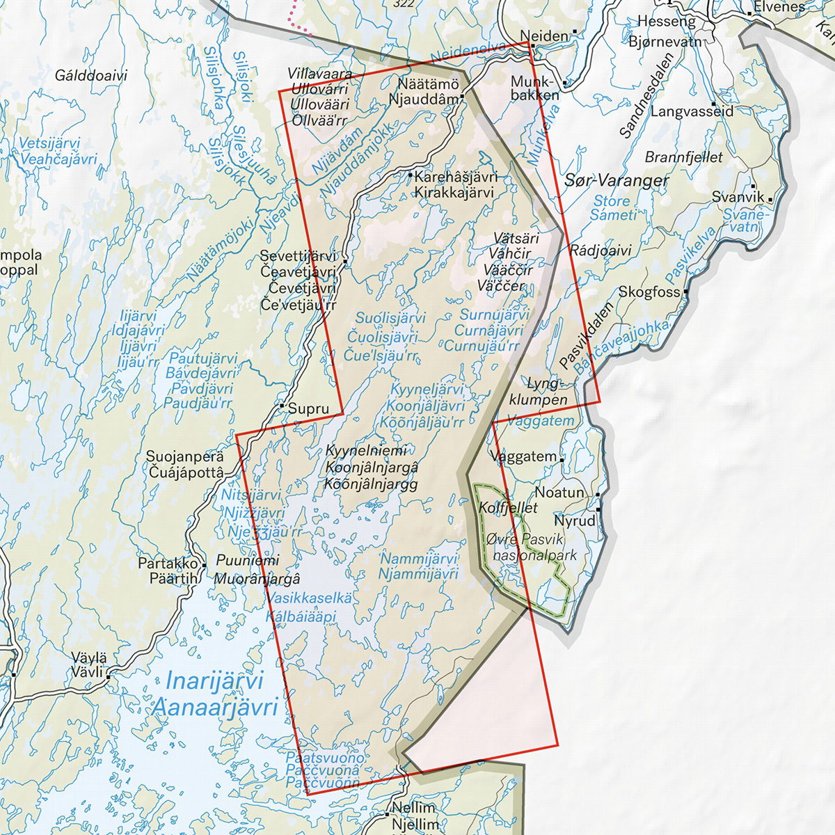 Mellem Inarijärvi og den norske grænse breder et mosaiklandskab af stenede fyrreskove, moser og hundredvis af småsøer sig. I nordøst rejser Vätsäris fjeldryg sig, som strækker sig mod Norge.