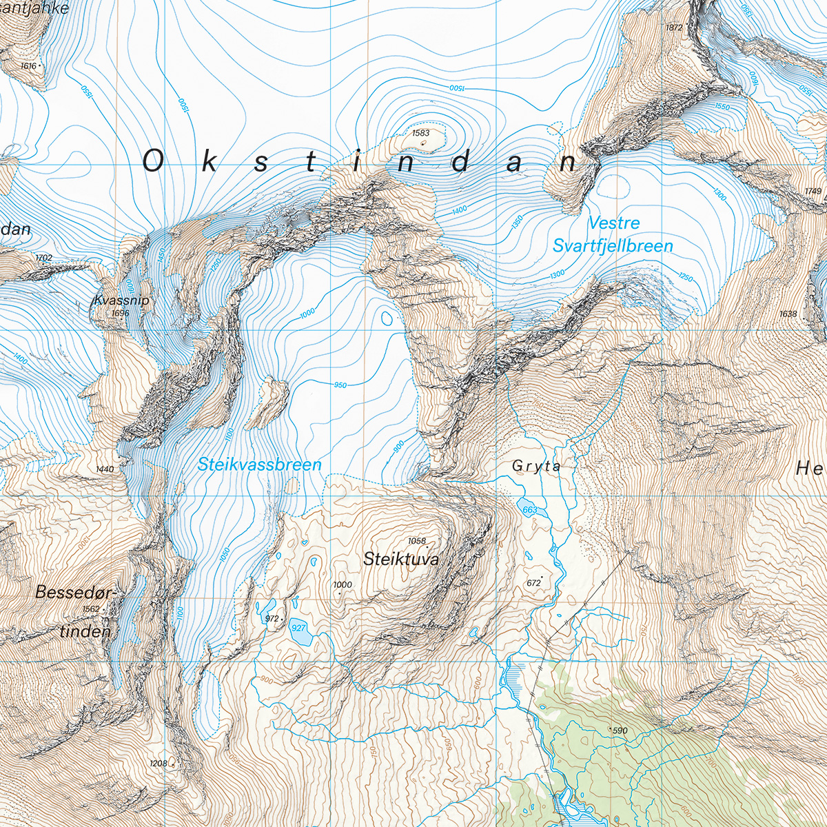 Et kart i målestokk 1:25 000 gir god støtte til deg som går på topptur, driver med brevandring eller på andre måter forlater de merkede stiene i dalbunnen og finner egne ruter oppe i høyfjellet. Det er laget i materialet Tyvek, som tåler vann, er beskyttet mot rifter og har lav vekt.