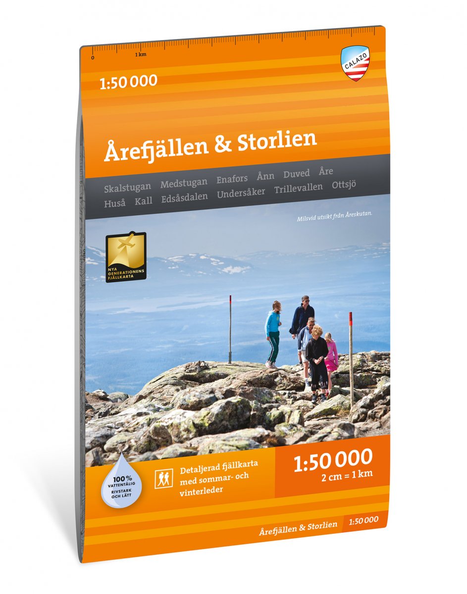 Stort utsnitt över Årefjällen centrerat på den ena sidan med bland annat Åre, Duved, Kall, Edsåsdalen, Trillevallen. Den andra sidan täcker fjällområdet mellan om Skalstugan i norr och Storlien samt Handöl i söder.
