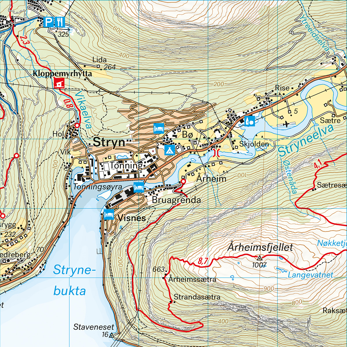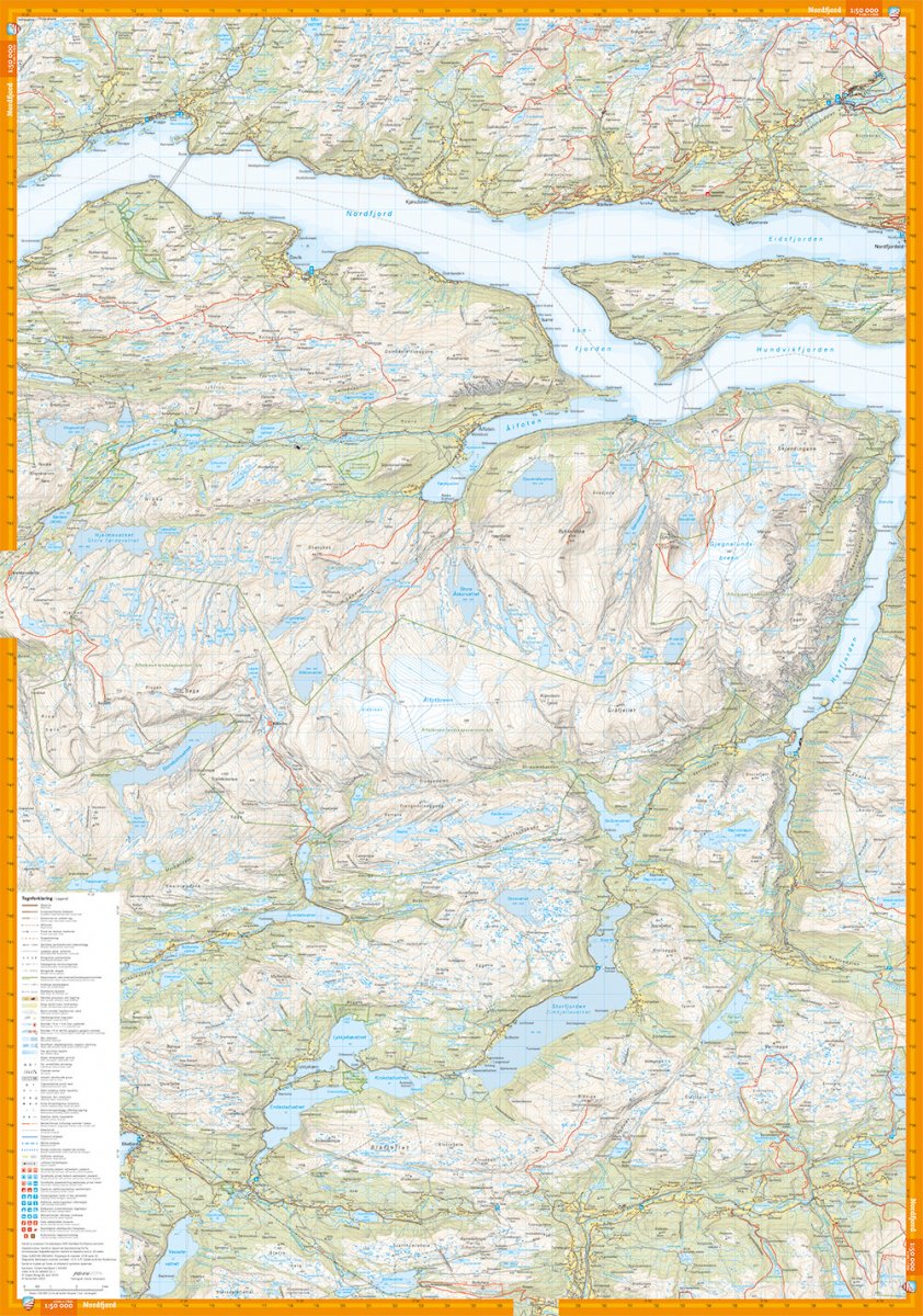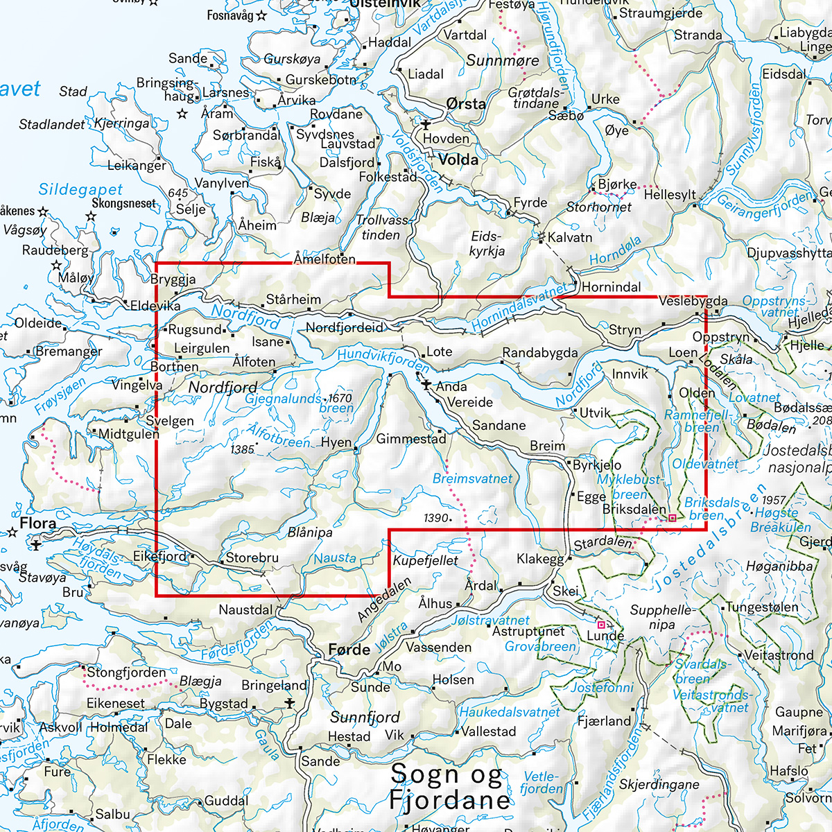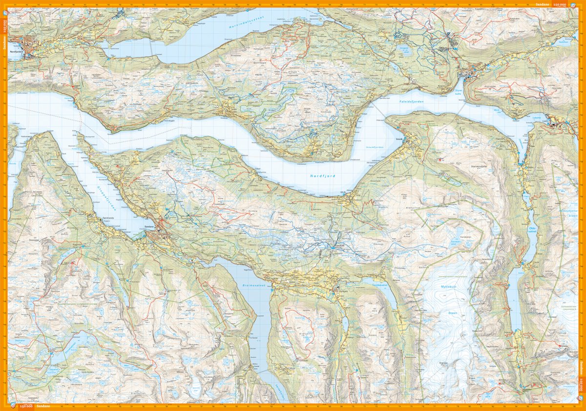 Med kartvisninger på både for- og baksiden dekker dette kartet hele Nordfjord med populære turområden som Ålfotbreen, Nordfjordeid og Stryn.