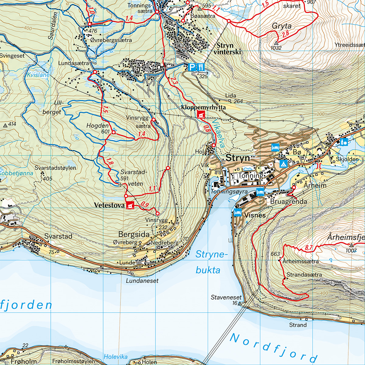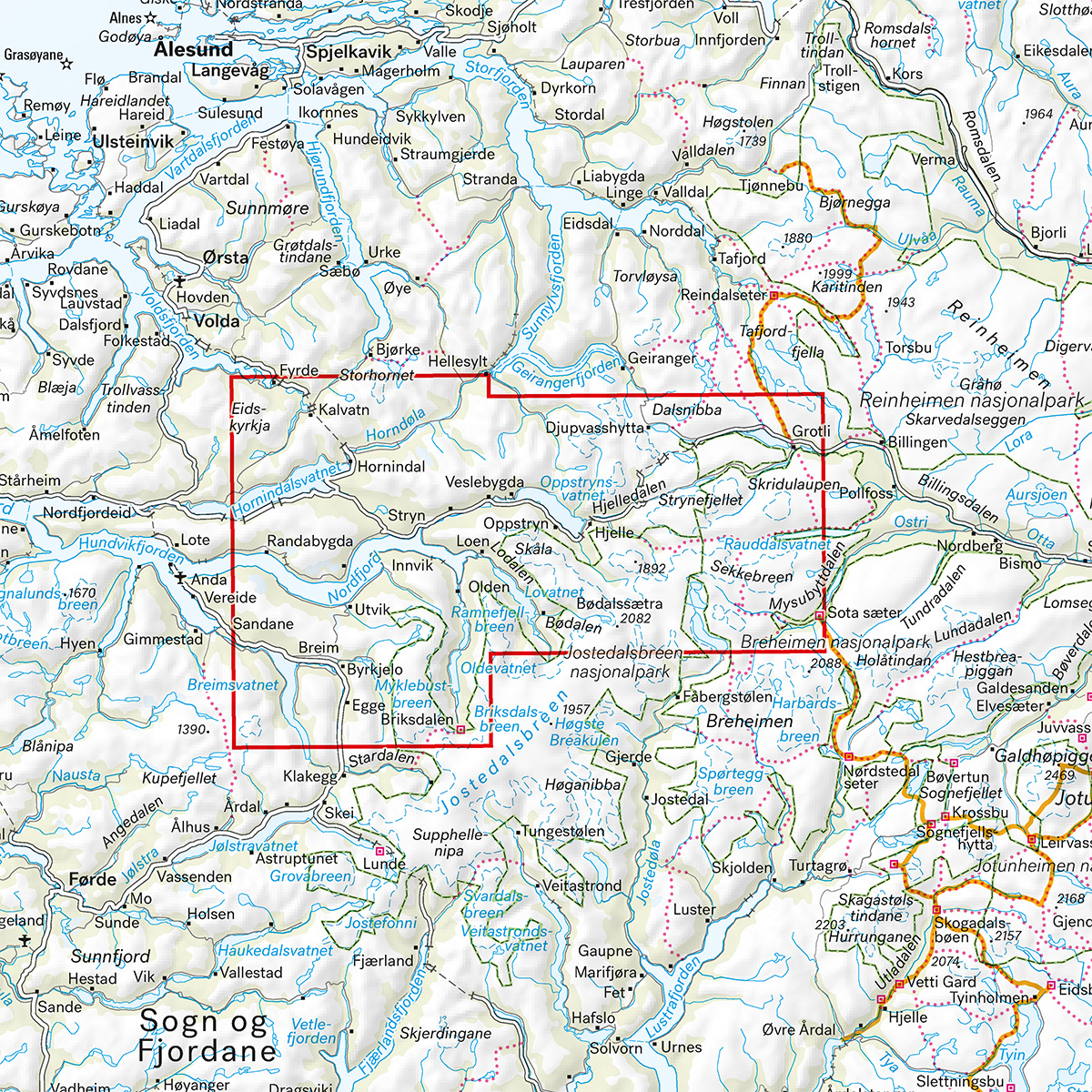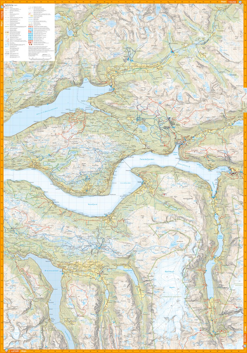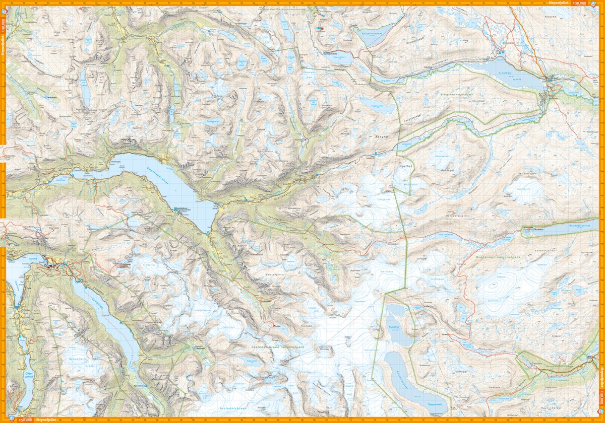 Med kartvisninger på både for- og baksiden dekker dette kartet området rundt Stryn og Strynefjellet. Klassiske turmål i området inkluderer blant annet Skåla, Briksdalen og Gamle Strynefjellsvegen.